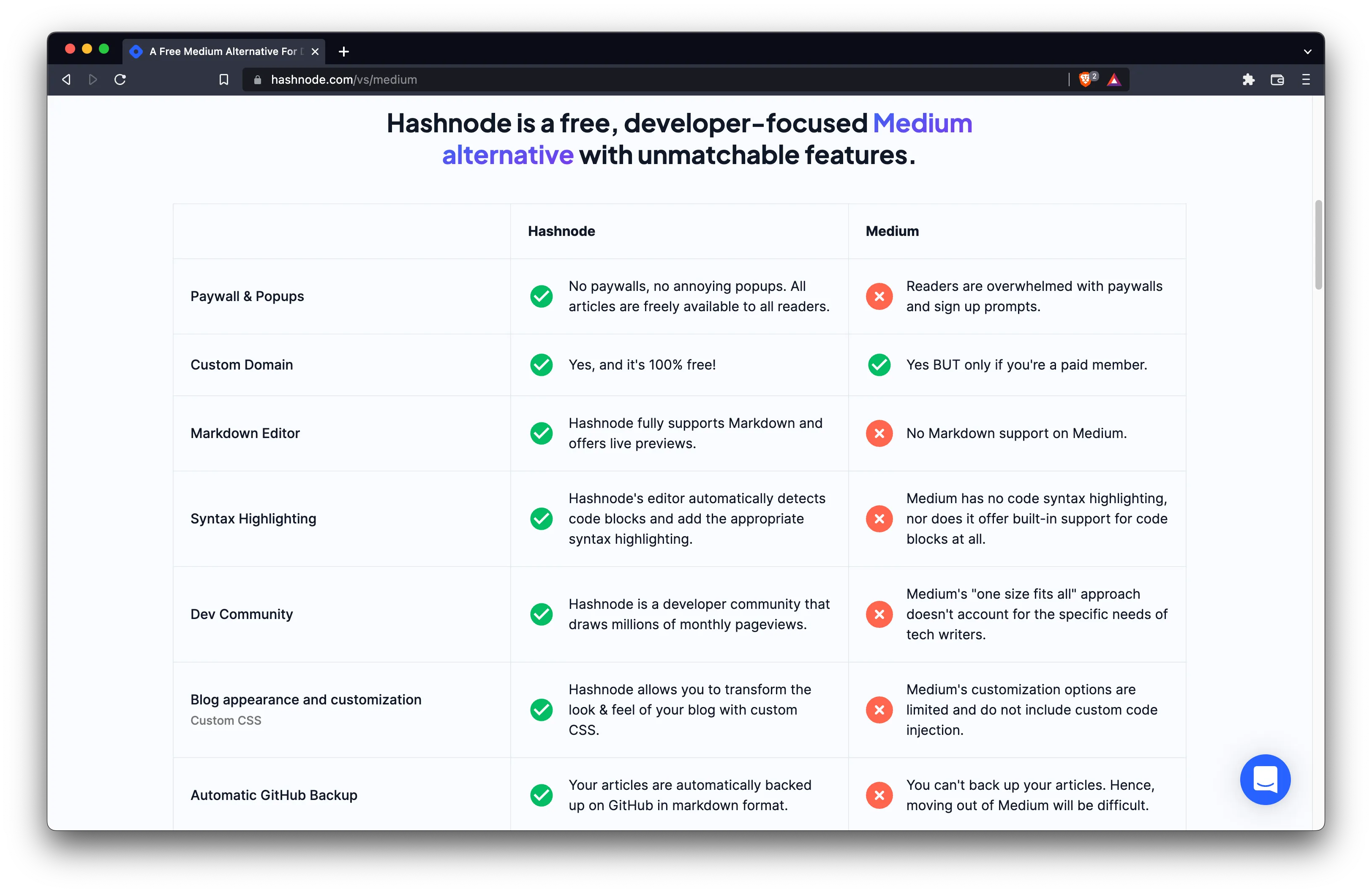 When I joined, the co-founders presented me with an ambitious challenge: We want to overtake Medium as the go-to blogging platform for software developers. To that end, I wrote copy for the Hashnode vs. Medium landing page, which became the second-highest converting page on the site after the homepage.