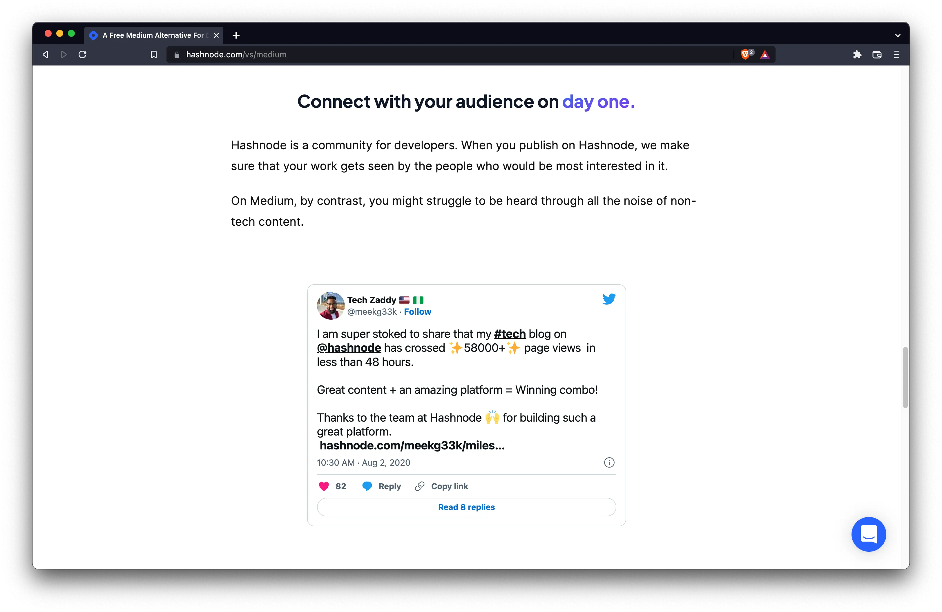 Of course, social proof is crucial for a piece like this. Hashnode had worked hard to cultivate an enthusiastic community on Twitter, so we liberally peppered this page with positive tweets from well-known users on the platform.